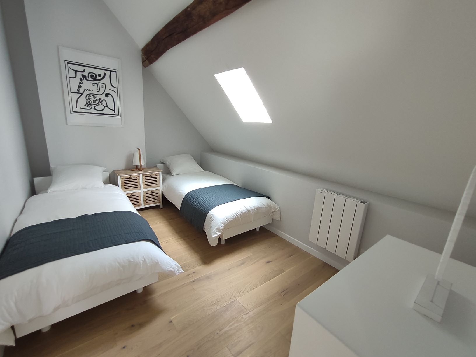 Il est composé au rez de chaussée d’une entrée avec penderie, à l’étage d’une cuisine équipée (four, micro onde, lave vaisselle, cafetière, théière), d’un salon avec TV écran plat, chaine hifi, accès WIFI gratuit, air conditionné, ainsi que de 2 chambres, l’une composée d’un lit double avec TV, la seconde de lits twin.